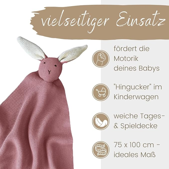 Incorporated into the blanket is a knitted cuddly bunny that provides comfort and a familiar feeling for your baby. A first cuddly toy that will stay with you – even when the blanket is long outgrown.