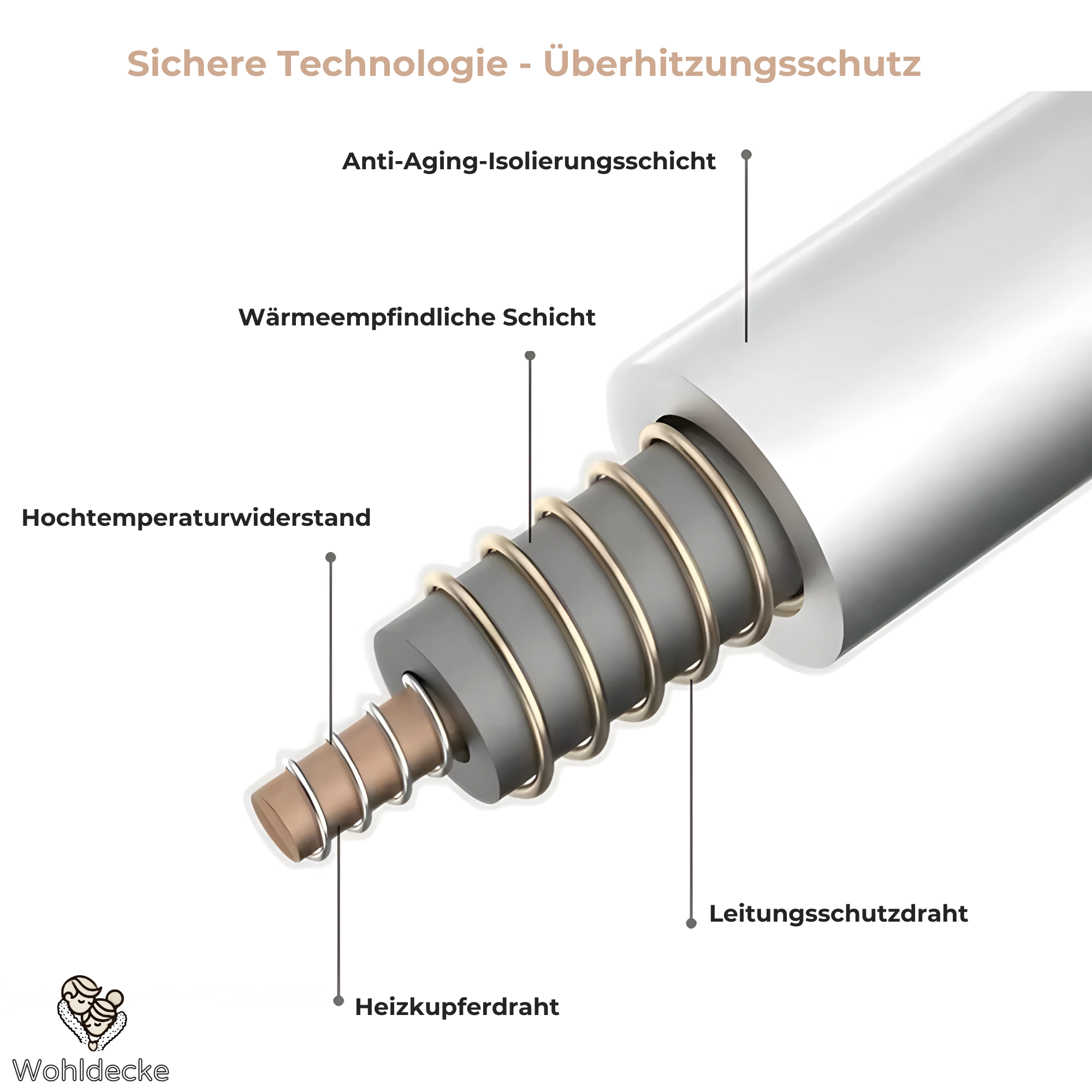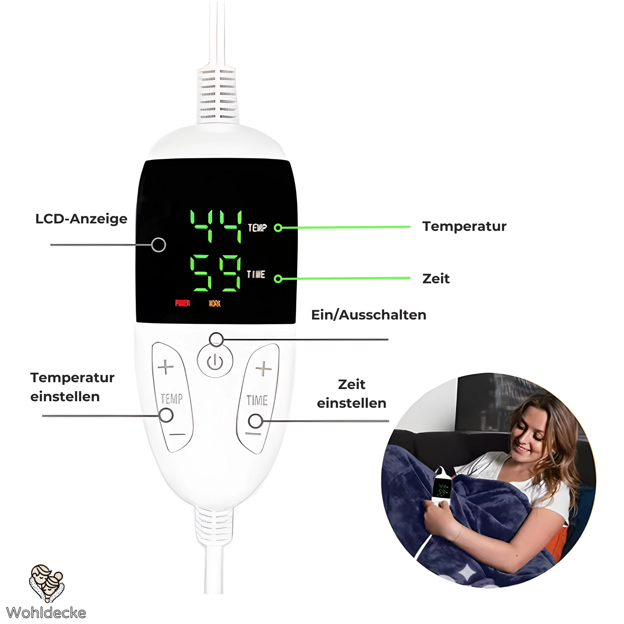 Die Temperatur kann in 6 Stufen (von 30 bis 45°C) eingestellt werden, was durch einen Controller geregelt wird. Der Controller steuert die Stromzufuhr zu den Heizdrähten, wodurch die Temperatur entsprechend der gewählten Stufe erhöht oder verringert wird. Durch diesen Prozess wird eine konstante und gleichmäßige Wärme erzeugt, die für Komfort sorgt, ohne zu überhitzen oder unangenehm zu sein. Die Decke schaltet sich nach 3 Stunden automatisch ab, um Energie zu sparen und die Sicherheit zu gewährleisten.